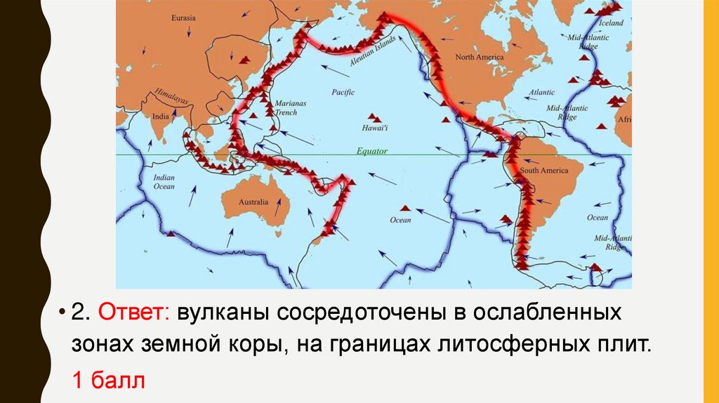 • 2. Ответ: вулканы сосредоточены в ослабленныхзонах земной коры, на границах литосферных плит.