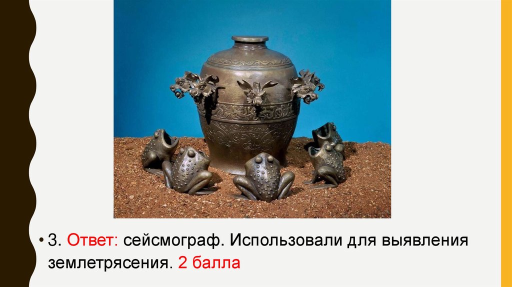 • 3. Ответ: сейсмограф. Использовали для выявленияземлетрясения. 2 балла