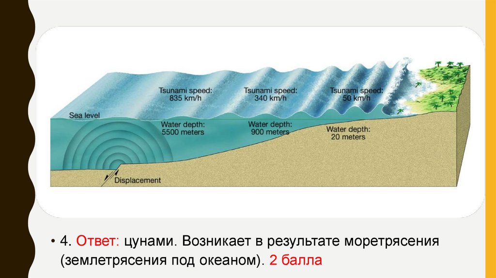 • 4. Ответ: цунами. Возникает в результате моретрясения(землетрясения под океаном). 2 балла