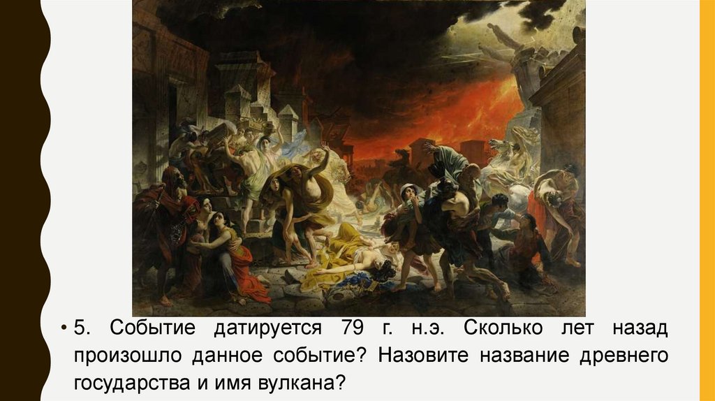 • 5. Событие датируется 79 г. н.э. Сколько лет назадпроизошло данное событие? Назовите название древнего