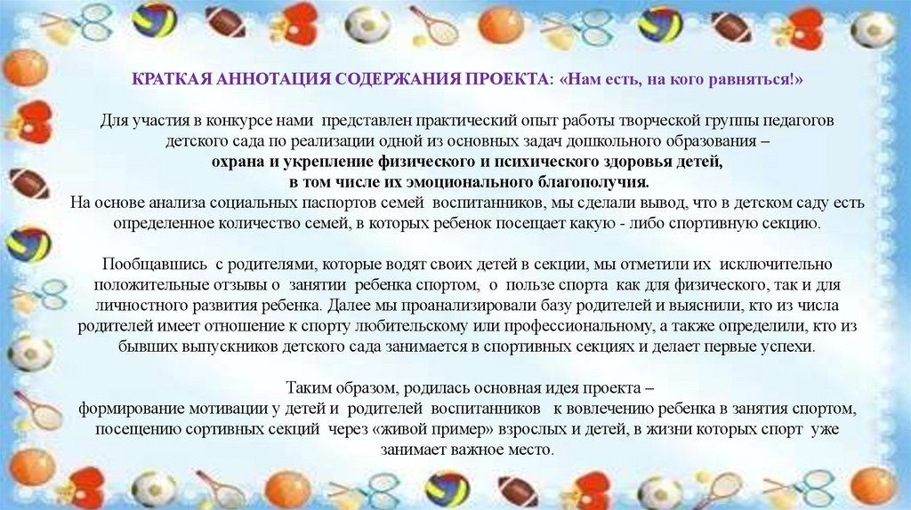 КРАТКАЯ АННОТАЦИЯ СОДЕРЖАНИЯ ПРОЕКТА: «Нам есть, на кого равняться!»Для участия в конкурсе нами представлен практический опыт работы творческой группы педагогов
