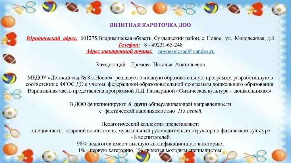 ВИЗИТНАЯ КАРОТОЧКА ДООЮридический адрес: 601275,Владимирская область, Суздальский район, с. Новое, ул. Молодежная, д.8