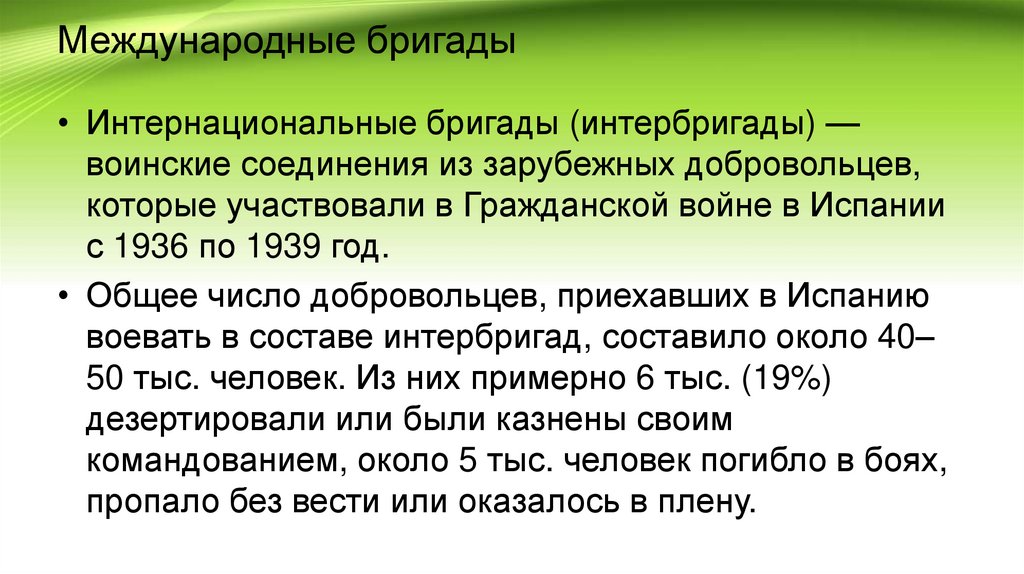 • Международные бригады. Советский Союз организовывал и