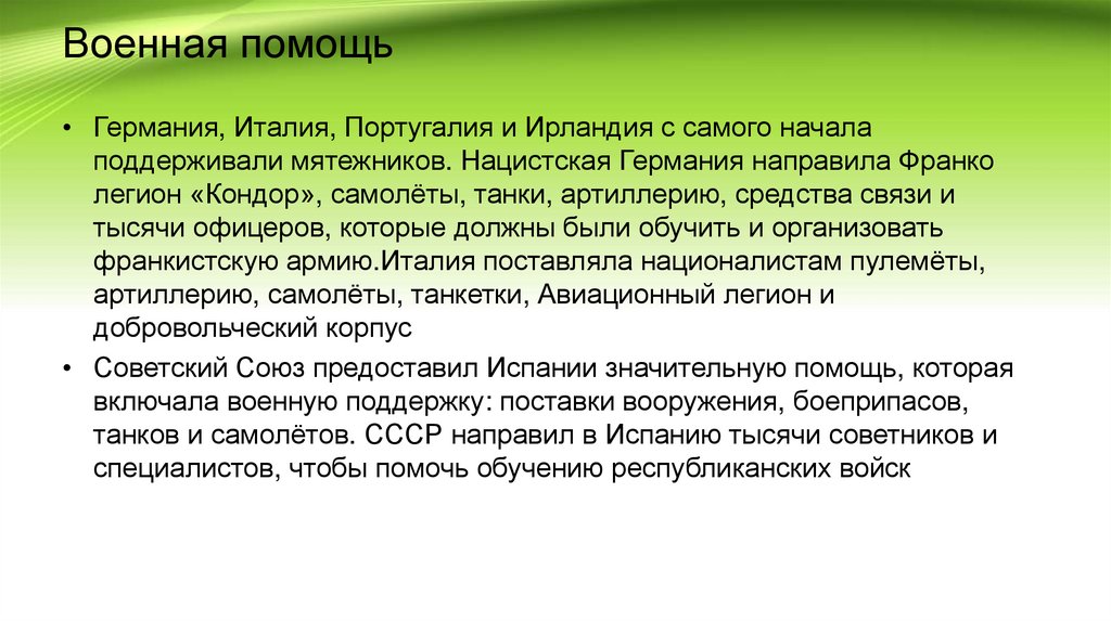Военная помощь• Германия, Италия, Португалия и Ирландия с самого начала