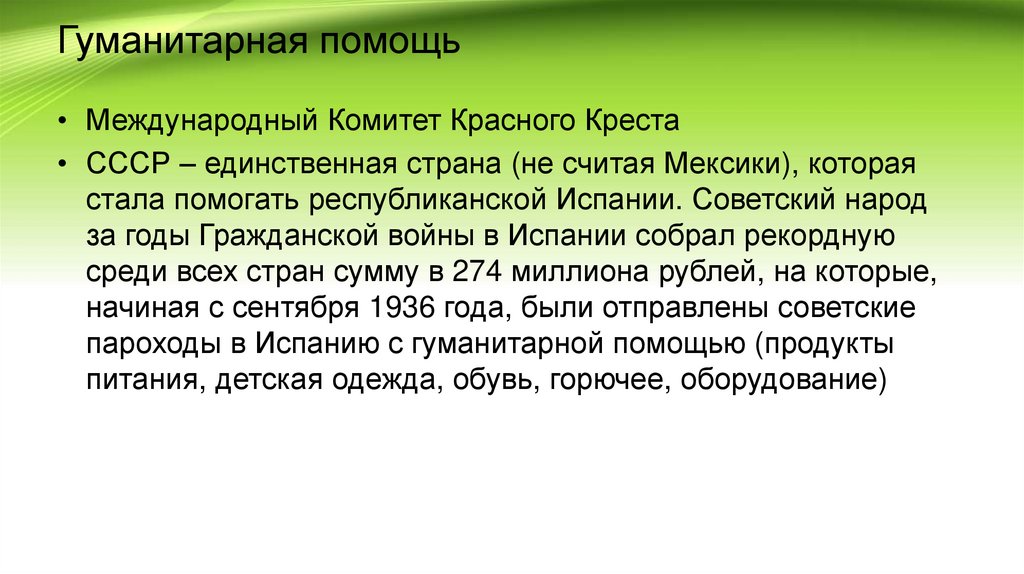 • Советский Союз предоставил Испании значительную помощь, которая