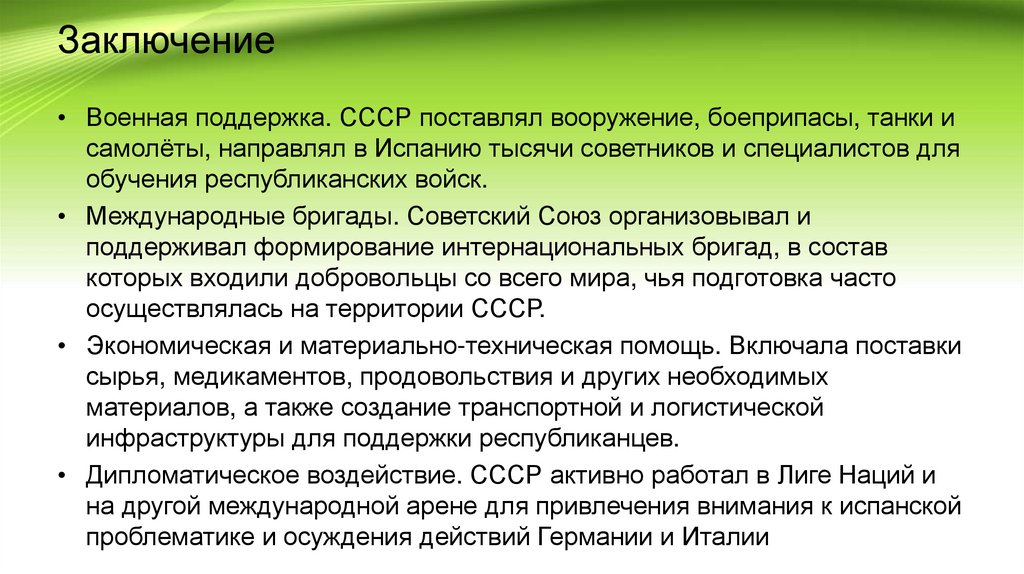 Заключение• Военная поддержка. СССР поставлял вооружение, боеприпасы, танки и