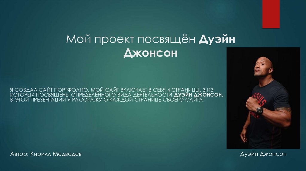 Я СОЗДАЛ САЙТ ПОРТФОЛИО, МОЙ САЙТ ВКЛЮЧАЕТ В СЕБЯ 4 СТРАНИЦЫ. 3 ИЗКОТОРЫХ ПОСВЯЩЕНЫ ОПРЕДЕЛЁННОГО ВИДА ДЕЯТЕЛЬНОСТИ ДУЭЙН ДЖОНСОН.
