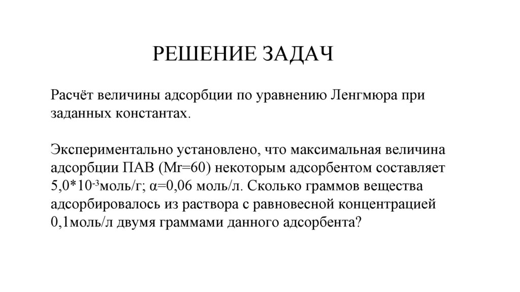 РЕШЕНИЕ ЗАДАЧРасчёт величины адсорбции по уравнению Ленгмюра при