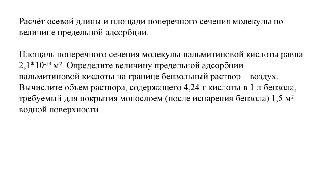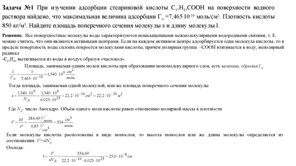 Задача №1 При изучении адсорбции стеариновой кислоты С17Н35СООН на поверхности водногораствора найдено, что максимальная величина адсорбции Г∞ =7,465.10-10 моль/см2. Плотность кислоты