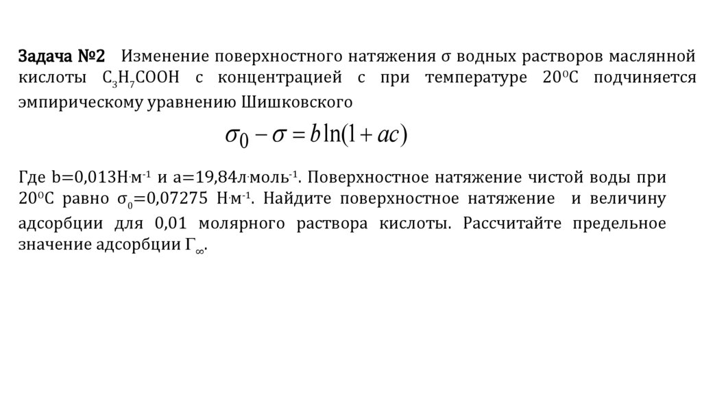 Задача №2 Изменение поверхностного натяжения σ водных растворов масляннойкислоты С3Н7СООН с концентрацией с при температуре 20ОС подчиняется