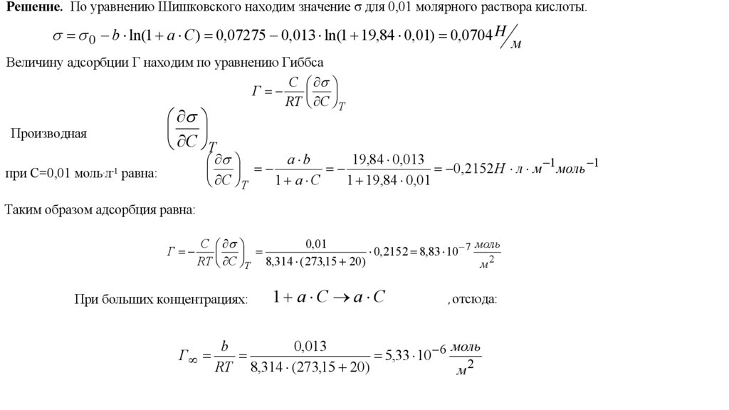 Решение. По уравнению Шишковского находим значение σ для 0,01 молярного раствора кислоты.0 b ln(1 a C ) 0,07275 0,013 ln(1 19,84 0,01) 0,0704 H м