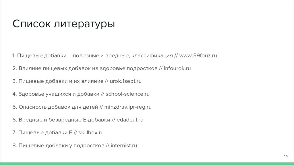 Список литературы1. Пищевые добавки – полезные и вредные, классификация // www.59fbuz.ru