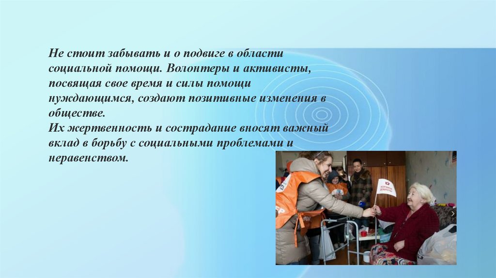 Не стоит забывать и о подвиге в областисоциальной помощи. Волонтеры и активисты,