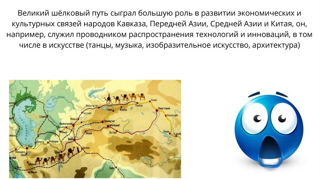 Великий шёлковый путь сыграл большую роль в развитии экономических икультурных связей народов Кавказа, Передней Азии, Средней Азии и Китая, он,