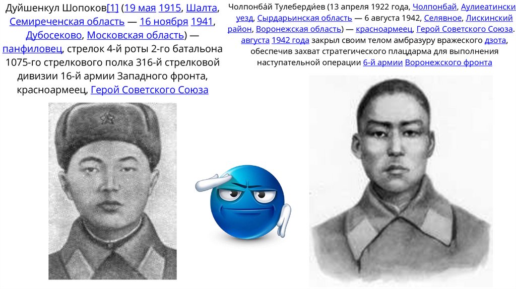 Дуйшенкул Шопоков[1] (19 мая 1915, Шалта, Чолпонба́й Тулеберди́ев (13 апреля 1922 года, Чолпонбай, Аулиеатинскийуезд, Сырдарьинская область — 6 августа 1942, Селявное, Лискинский