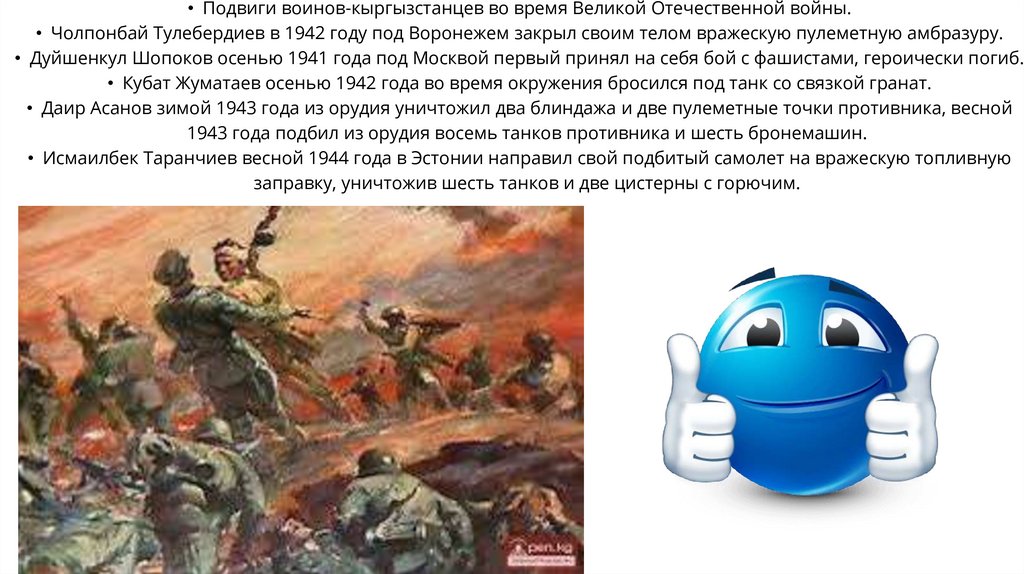 • Подвиги воинов-кыргызстанцев во время Великой Отечественной войны.• Чолпонбай Тулебердиев в 1942 году под Воронежем закрыл своим телом вражескую пулеметную амбразуру.