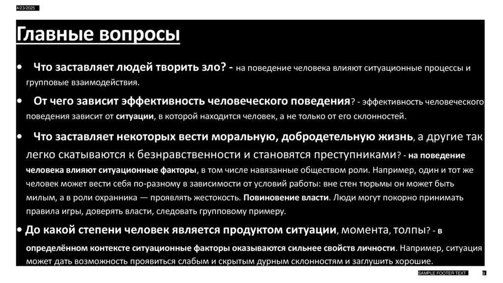 • Что заставляет людей творить зло? - на поведение человека влияют ситуационные процессы и