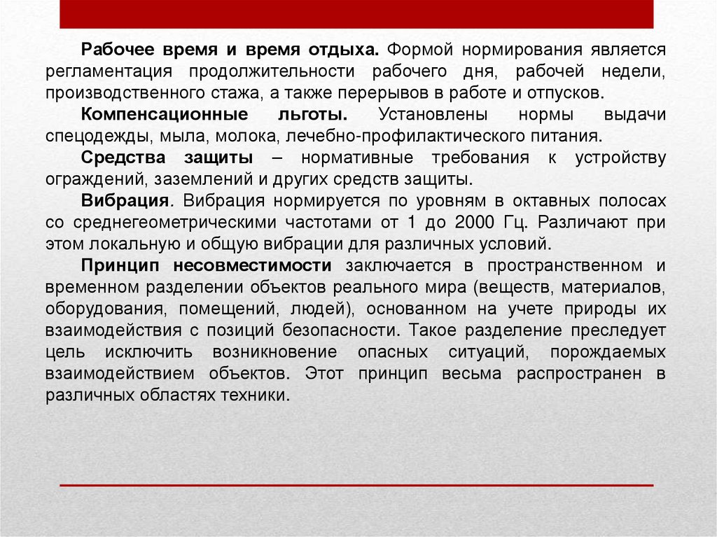 Рабочее время и время отдыха. Формой нормирования являетсярегламентация продолжительности рабочего дня, рабочей недели,