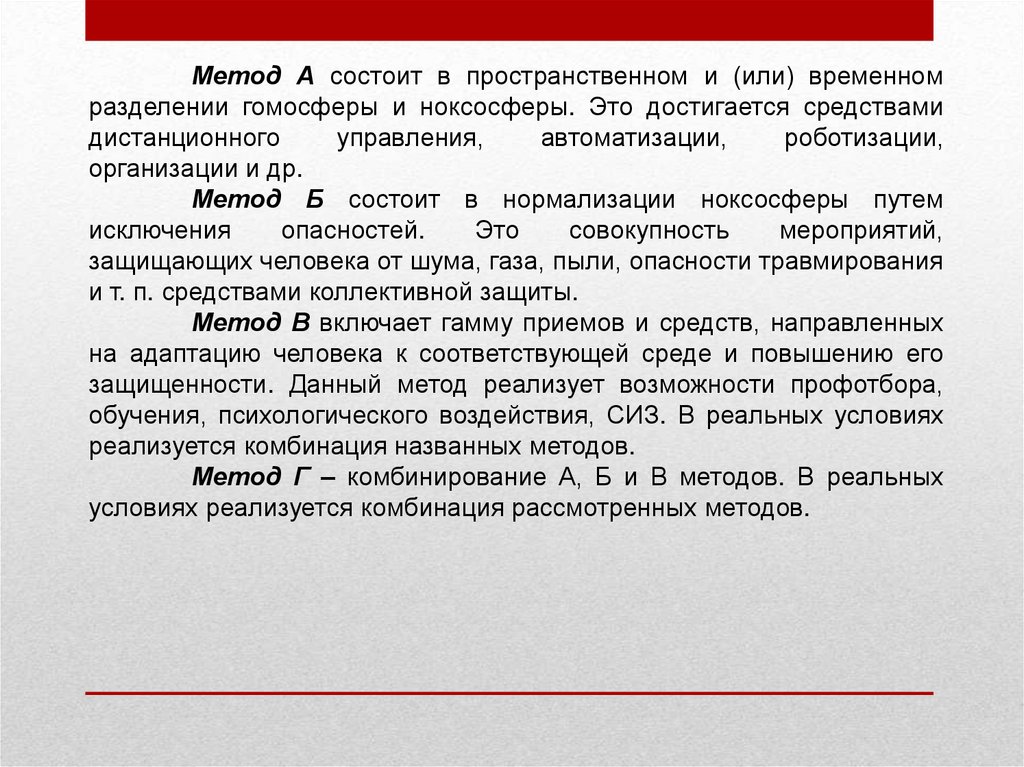Метод А состоит в пространственном и (или) временномразделении гомосферы и ноксосферы. Это достигается средствами