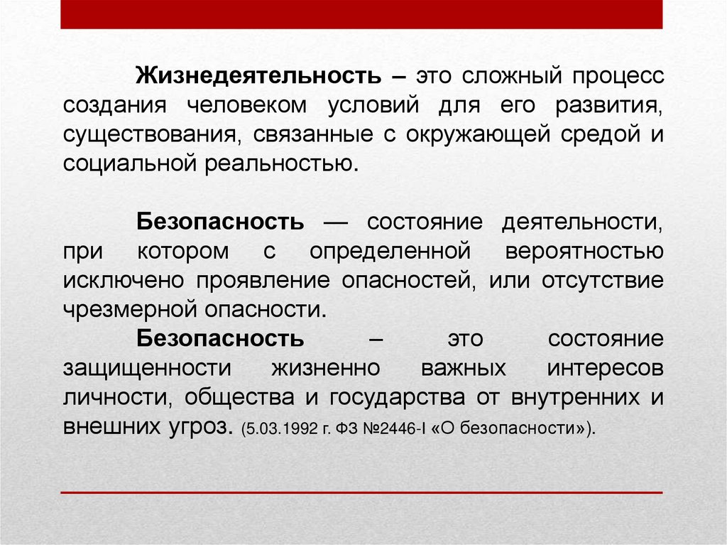 Жизнедеятельность – это сложный процесссоздания человеком условий для его развития,