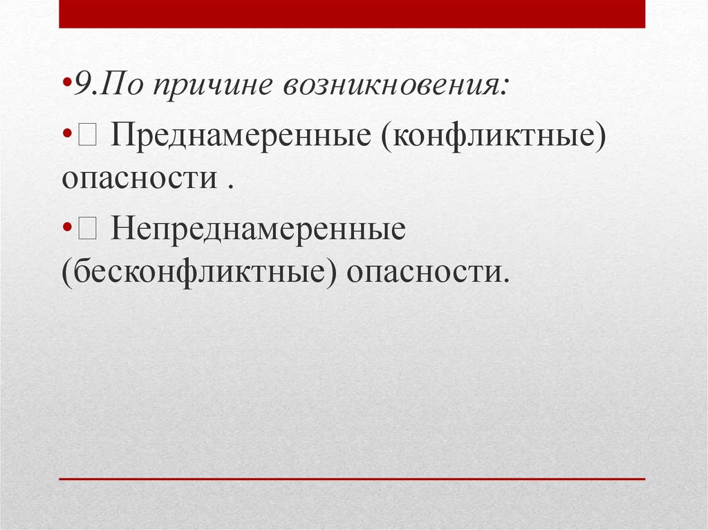 •9.По причине возникновения:• Преднамеренные (конфликтные)