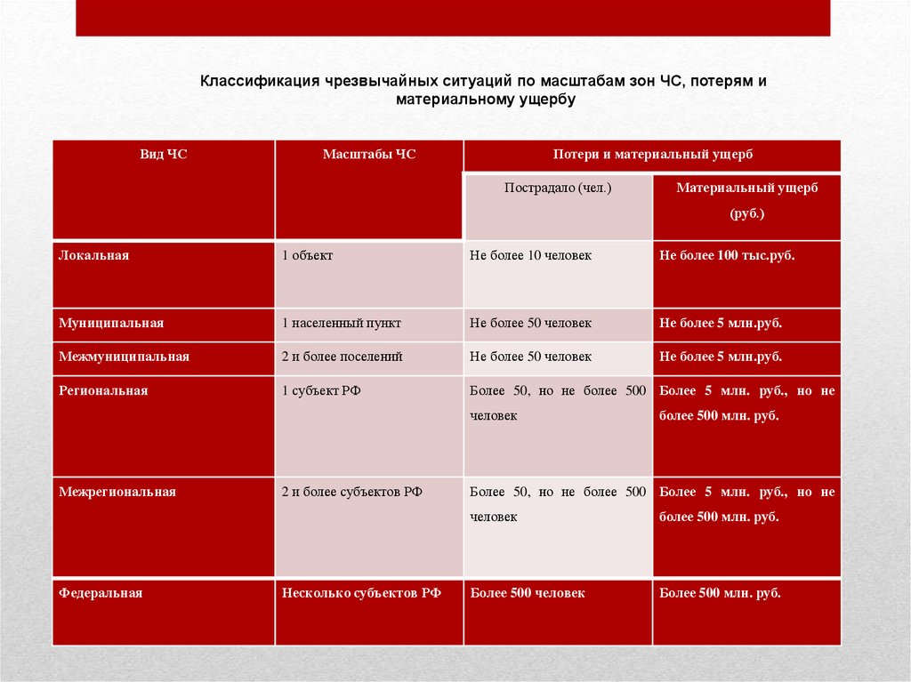 Классификация чрезвычайных ситуаций по масштабам зон ЧС, потерям иматериальному ущербу