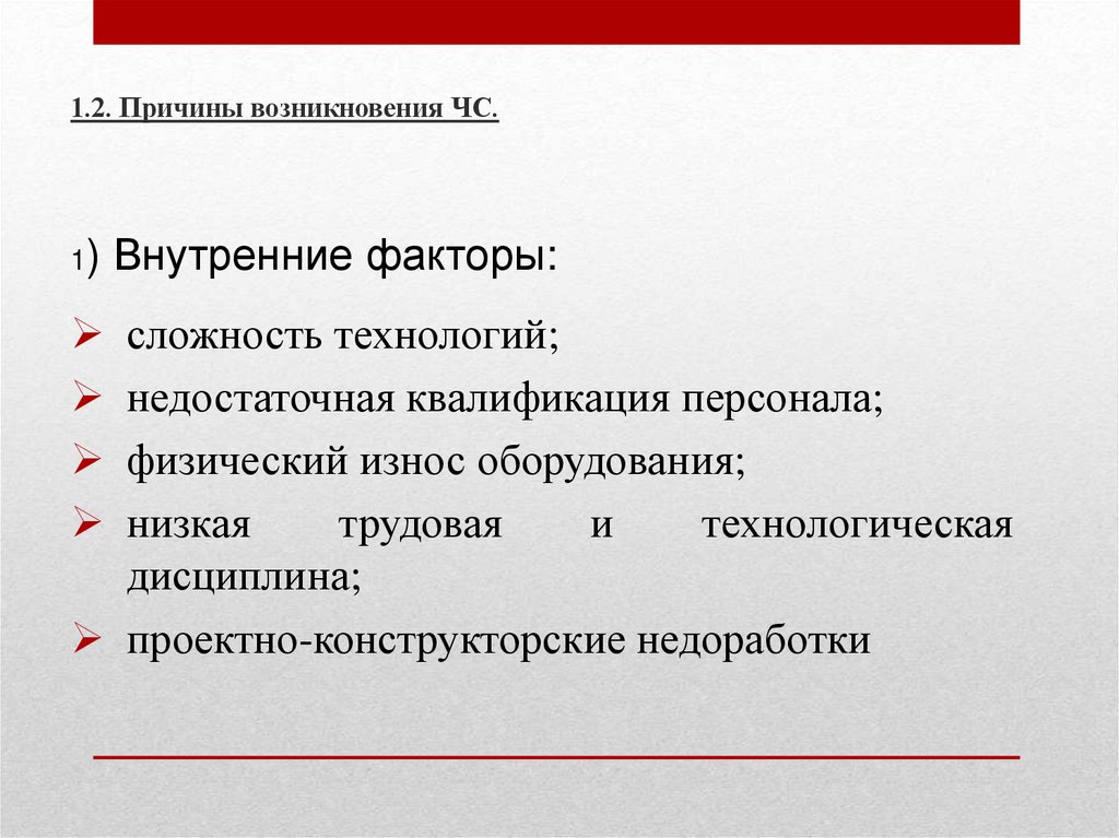 1.2. Причины возникновения ЧС.1) Внутренние факторы:
