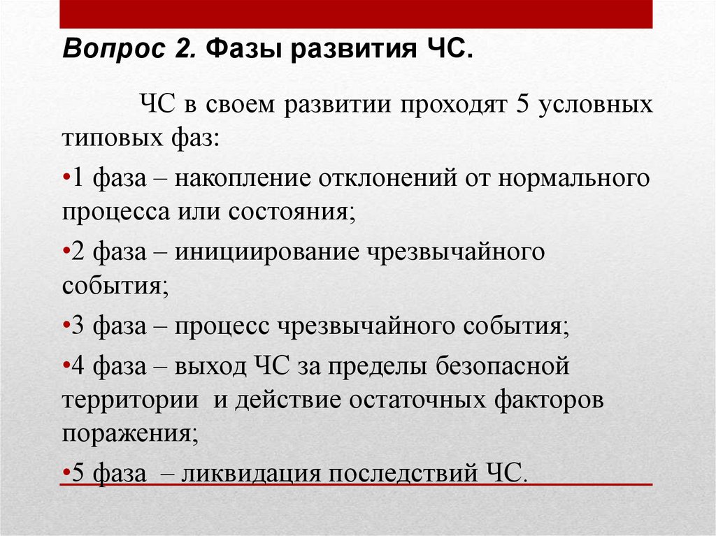 Вопрос 2. Фазы развития ЧС.ЧС в своем развитии проходят 5 условных