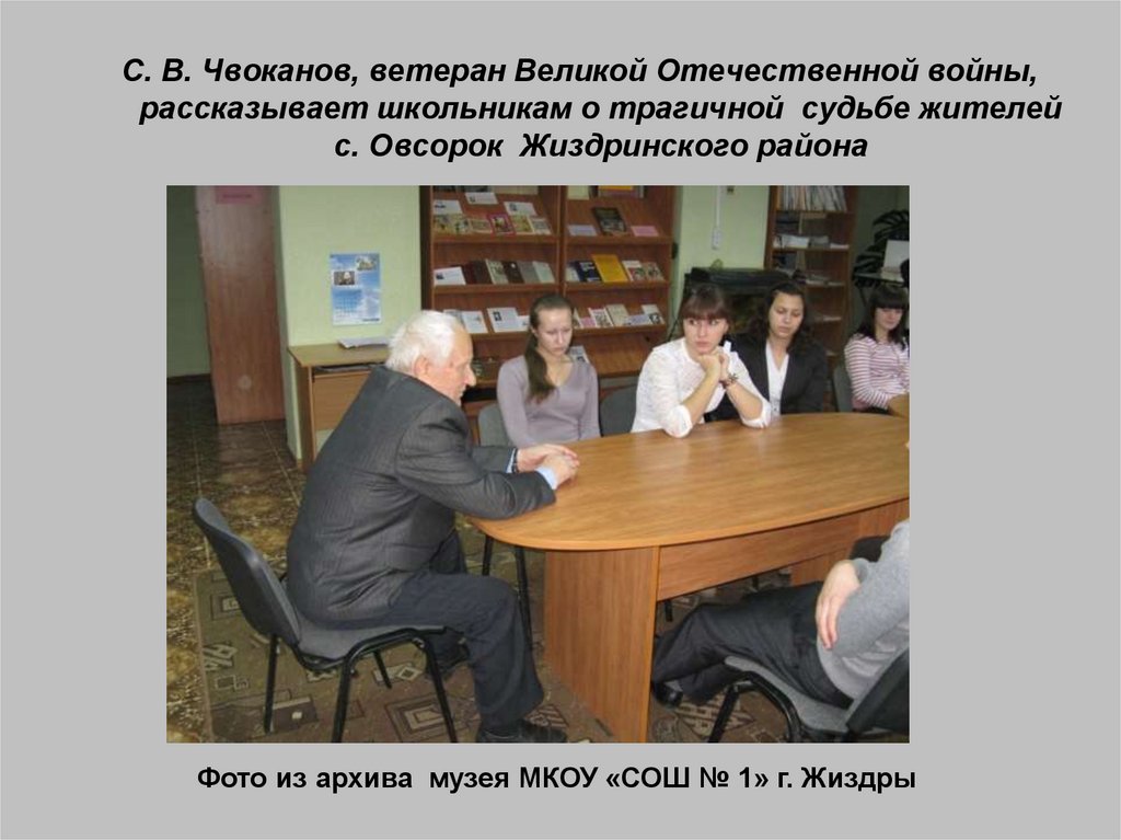 С. В. Чвоканов, ветеран Великой Отечественной войны,рассказывает школьникам о трагичной судьбе жителей