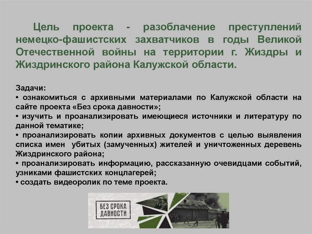 Цель проекта - разоблачение преступленийнемецко-фашистских захватчиков в годы Великой