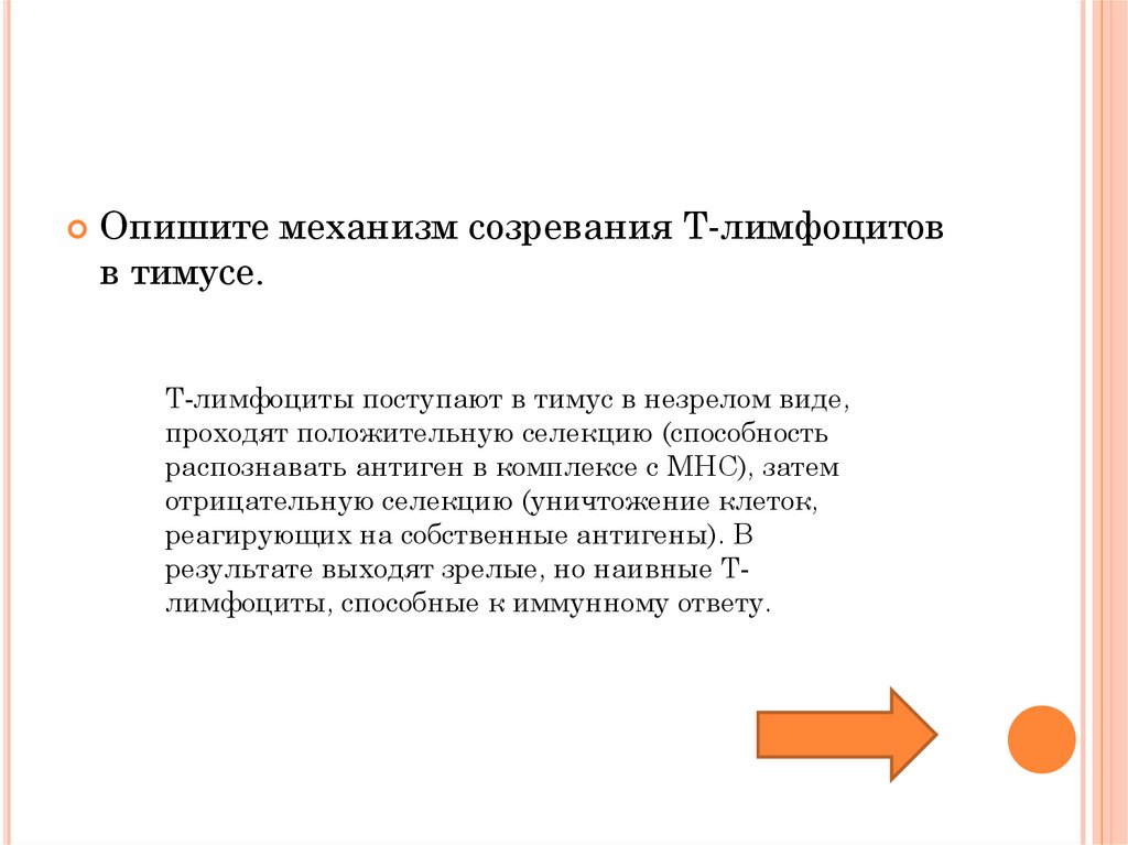 результате выходят зрелые, но наивные Тлимфоциты, способные к иммунному ответу.
