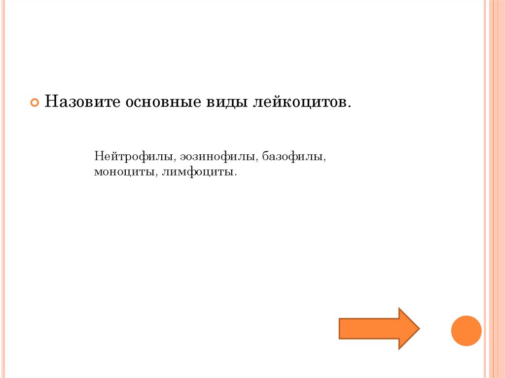 Назовите основные виды лейкоцитов.Нейтрофилы, эозинофилы, базофилы,