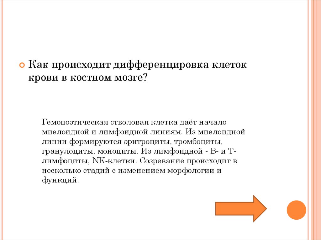 гранулоциты, моноциты. Из лимфоидной - В- и Тлимфоциты, NK-клетки. Созревание происходит в