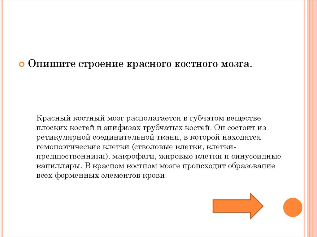 Опишите строение красного костного мозга.Красный костный мозг располагается в губчатом веществе