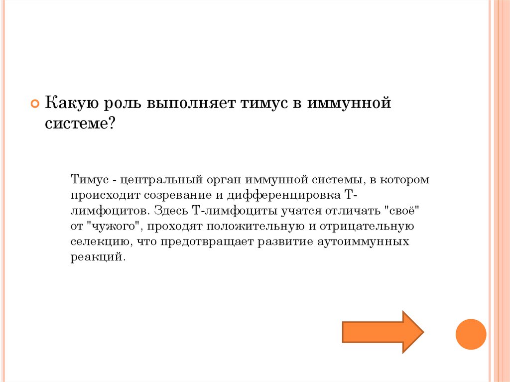 происходит созревание и дифференцировка Тлимфоцитов. Здесь Т-лимфоциты учатся отличать "своё"
