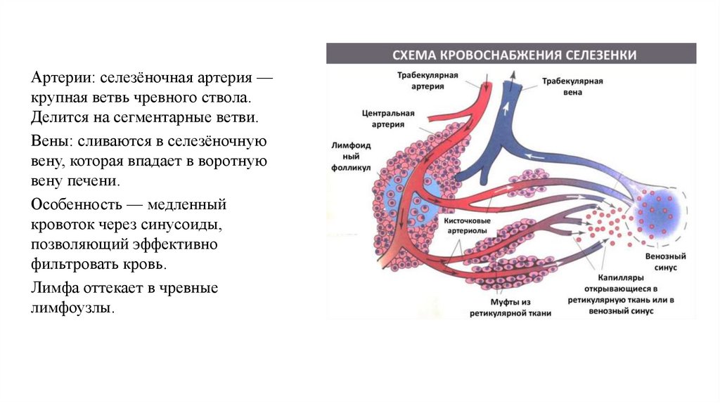 Артерии: селезёночная артерия —крупная ветвь чревного ствола.