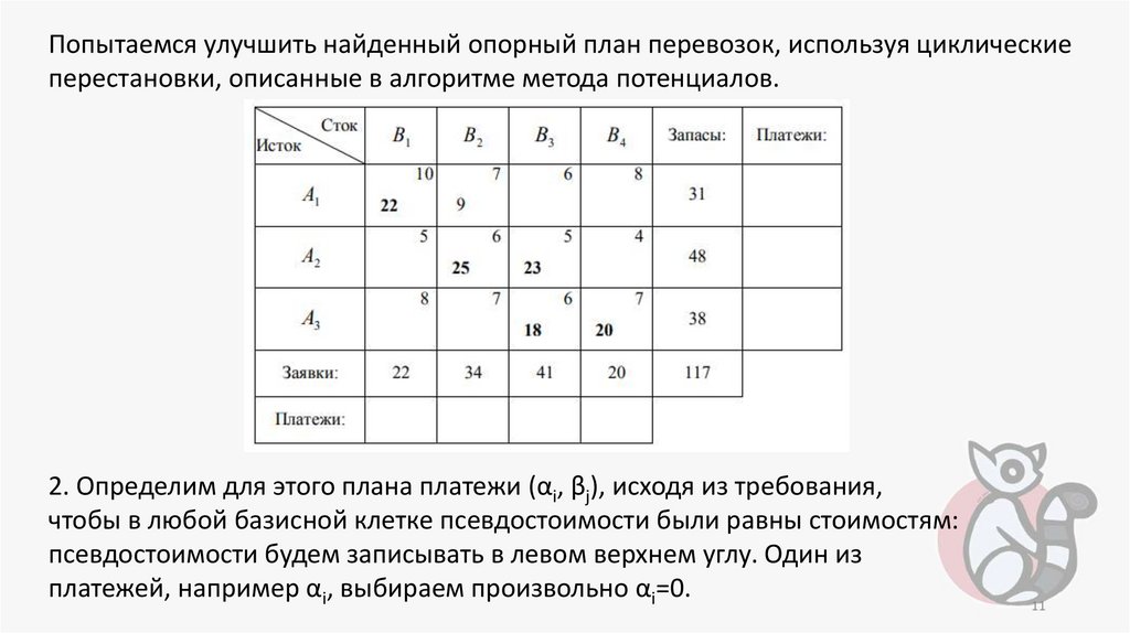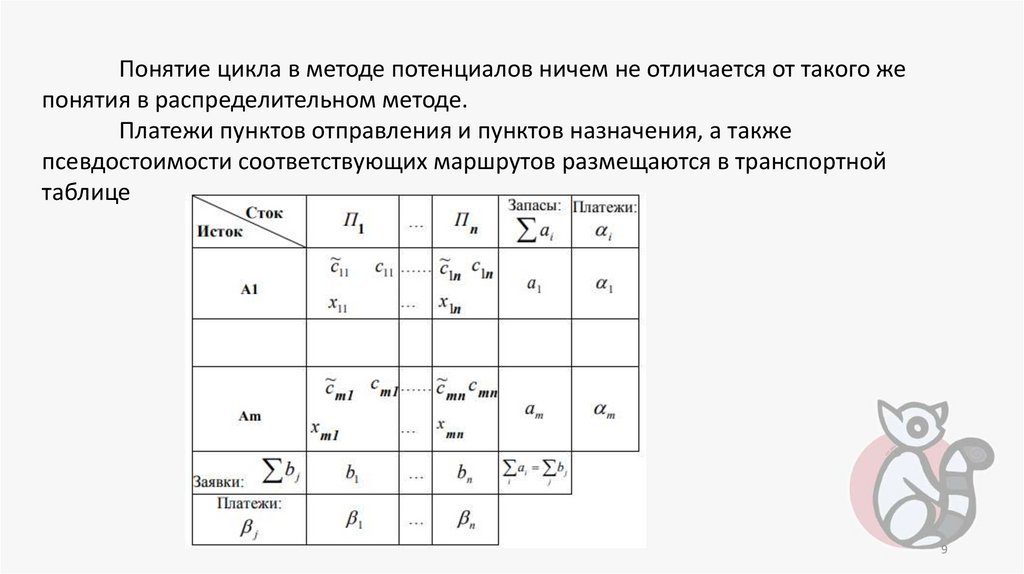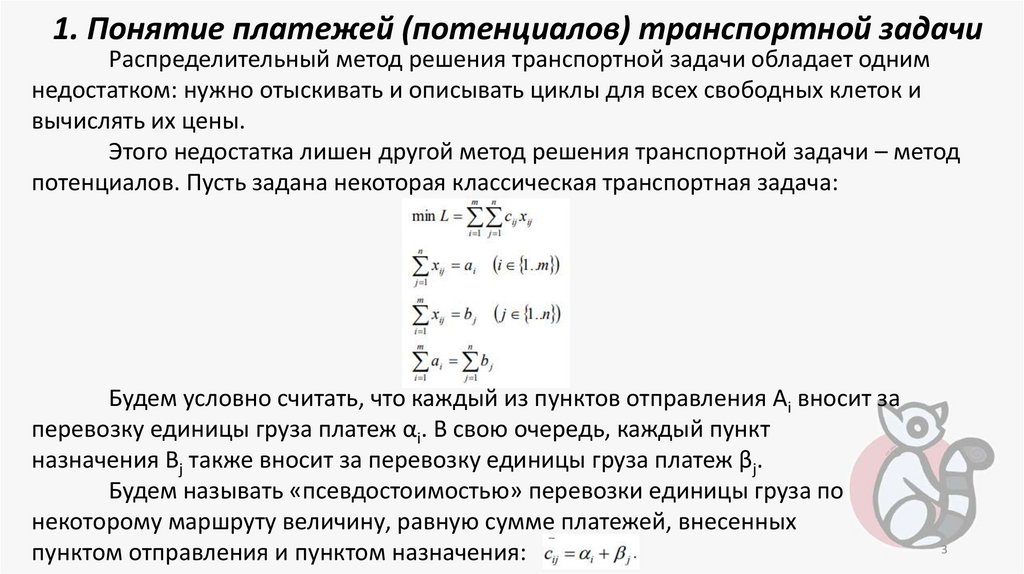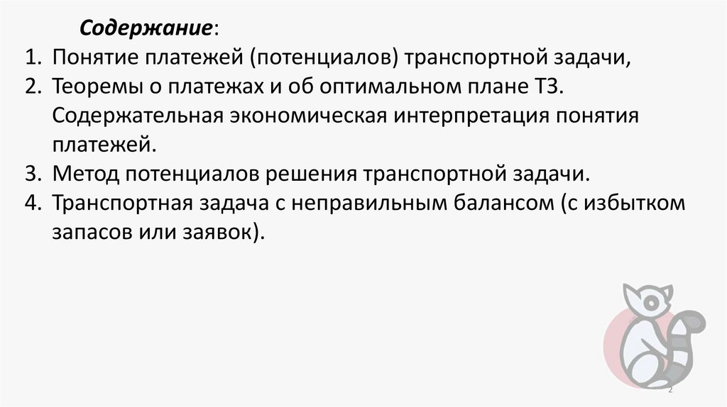 Содержание:1. Понятие платежей (потенциалов) транспортной задачи,