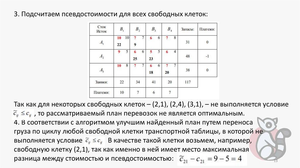 3. Подсчитаем псевдостоимости для всех свободных клеток:Так как для некоторых свободных клеток – (2,1), (2,4), (3,1), – не выполняется условие