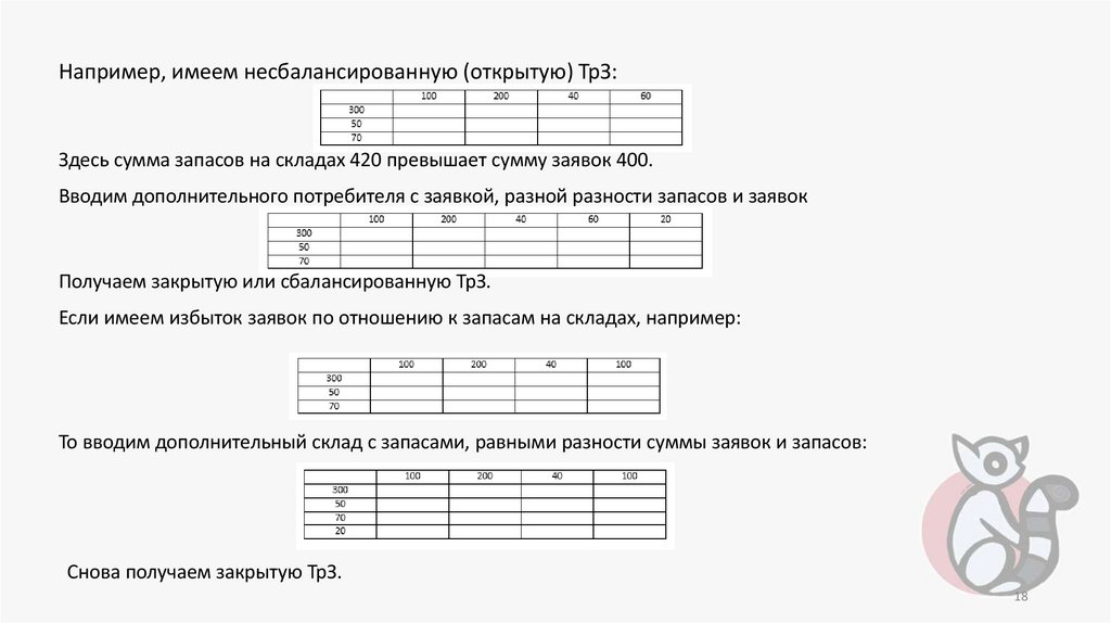 Например, имеем несбалансированную (открытую) ТрЗ:Здесь сумма запасов на складах 420 превышает сумму заявок 400.