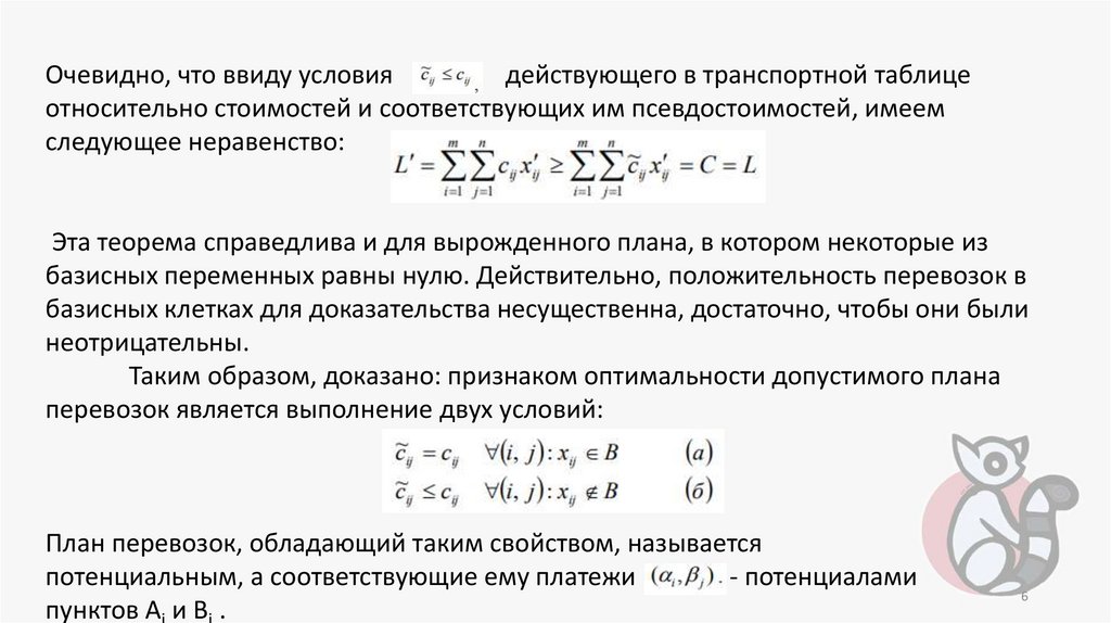 Теорема об оптимальном плане транспортной задачи:Если для всех базисных клеток некоторого допустимого плана перевозок