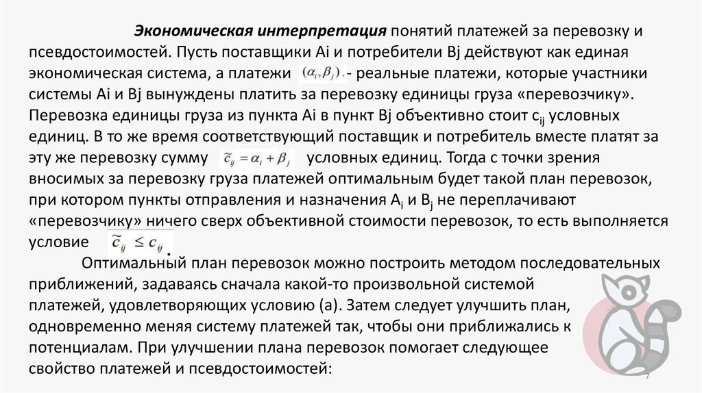 Экономическая интерпретация понятий платежей за перевозку ипсевдостоимостей. Пусть поставщики Аi и потребители Bj действуют как единая