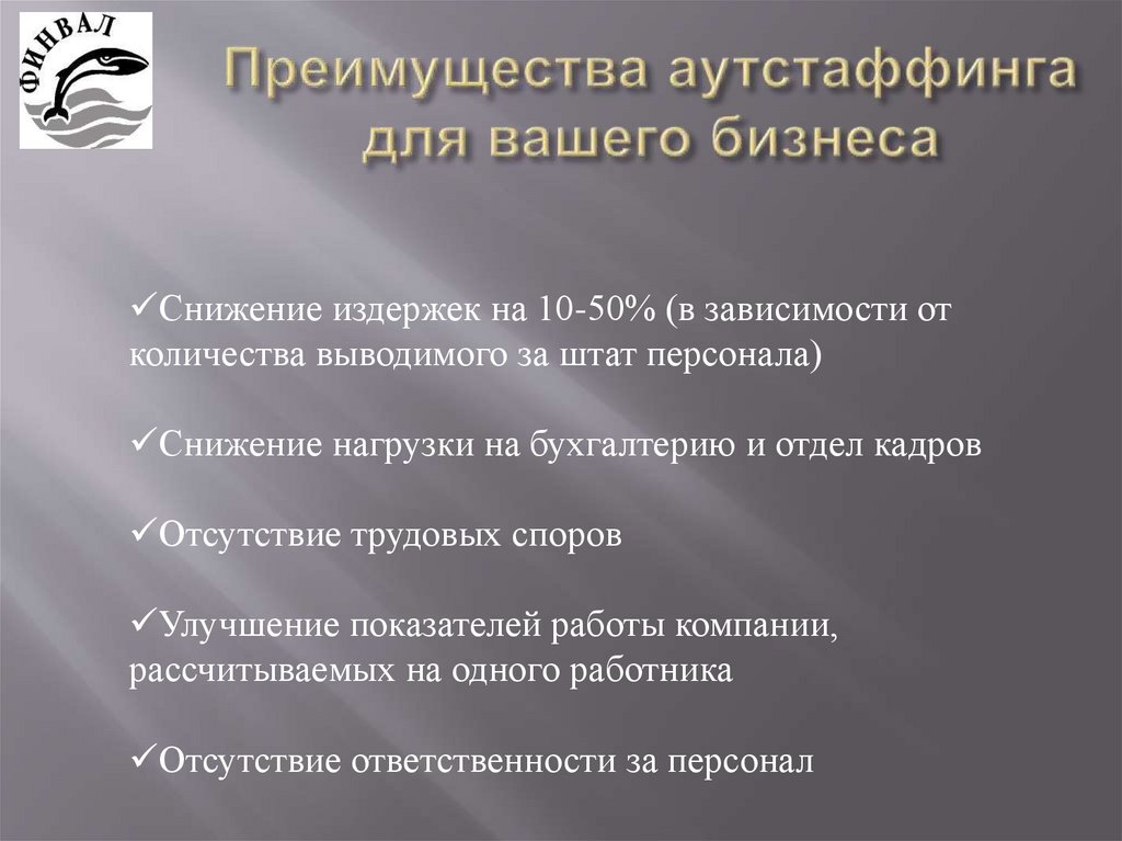 Снижение издержек на 10-50% (в зависимости отколичества выводимого за штат персонала)