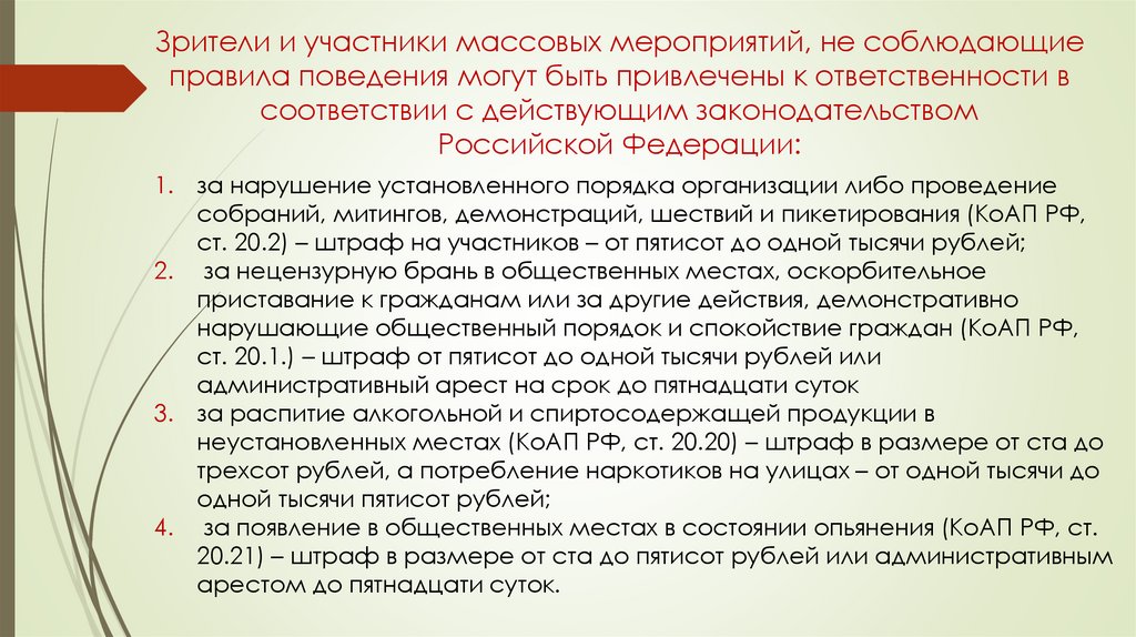 Зрители и участники массовых мероприятий, не соблюдающиеправила поведения могут быть привлечены к ответственности в