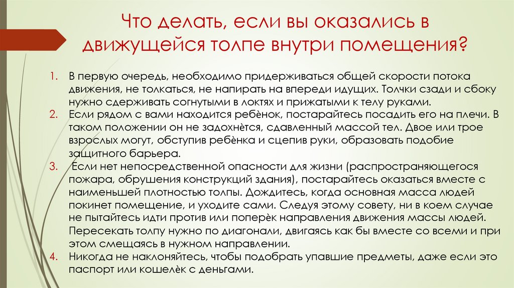 Что делать, если вы оказались вдвижущейся толпе внутри помещения?