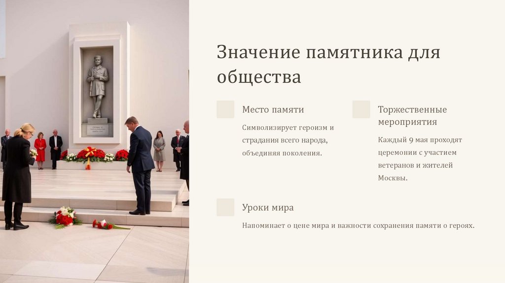 Напоминает о цене мира и важности сохранения памяти о героях.