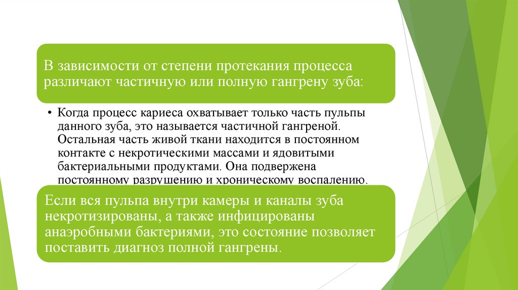 В зависимости от степени протекания процессаразличают частичную или полную гангрену зуба: