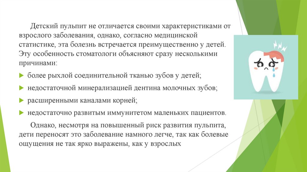 Детский пульпит не отличается своими характеристиками отвзрослого заболевания, однако, согласно медицинской
