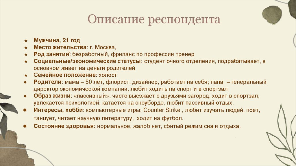 Социальные/экономические статусы: студент очного отделения, подрабатывает, в
