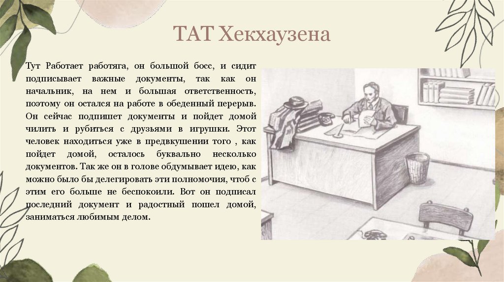 Тут Работает работяга, он большой босс, и сидитподписывает важные документы, так как он