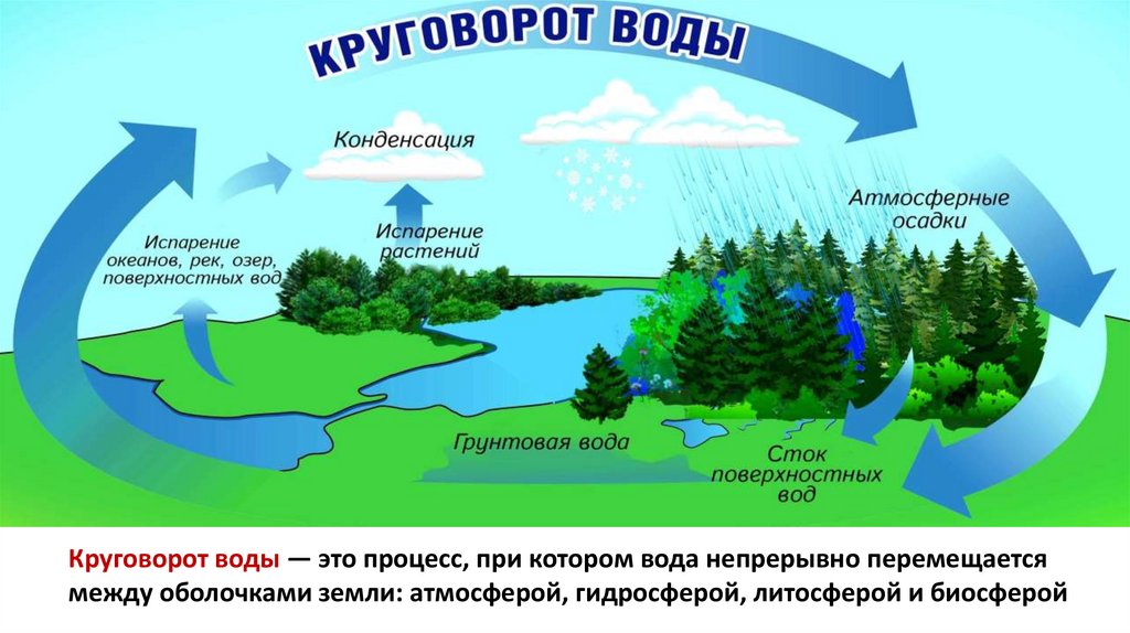 Круговорот воды — это процесс, при котором вода непрерывно перемещаетсямежду оболочками земли: атмосферой, гидросферой, литосферой и биосферой